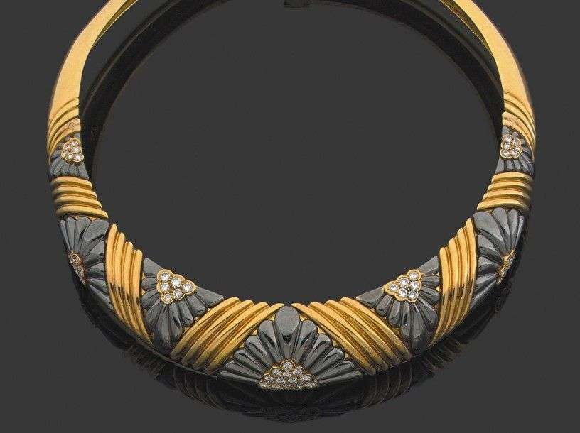 Collier rigide en or jaune 18K orné de motifs rayonnants en acier sertis au centre de brillants et rehaussés de godrons en or jaune. Signé. Vers 1980. Diam.: 12 cm env - Poids brut: 144 g. A diamond, steel and yellow gold neckalce by Chaumet.