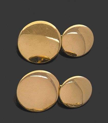 Paire de boutons de manchettes ronds en or jaune 18k. Signés et numérotés, un disque postérieur. Poids brut: 10.4 g A yellow gold pair of cuff links by Cartier.