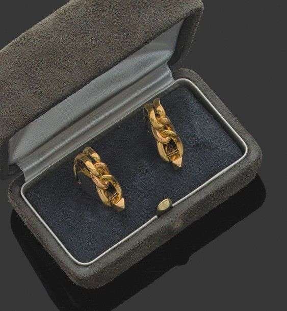 Paire de boutons de manchettes "étrier" en or jaune 18k. Signés et poinçon de maître. Dans un écrin. Poids brut: 16.8gr A yellow gold pair of cuff links by Boucheron.
