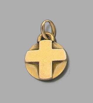 Médaille en or jaune 18k orné d'une croix. Signée et poinçon de maître. Avec une chaine en or jaune - Poids brut: 9.54gr A yellow gold pendant by Jean Després.