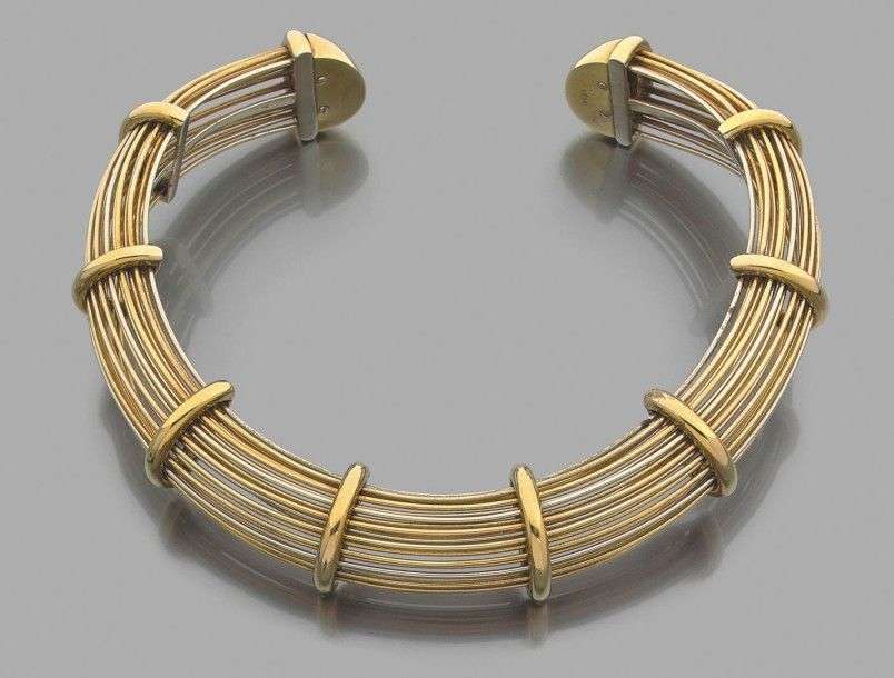 Collier torque composé de fils d'or jaune, rose et gris 18k. Signé Poids brut: 206.82 gr A pink, yellow and white gold necklace by Poiray.