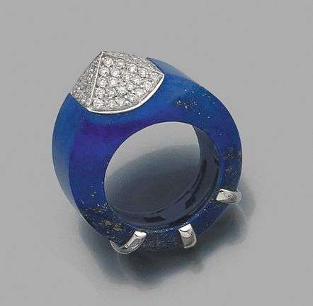 Importante bague en lapis-lazuli formée d'un anneau à pans coupés orné d'un cône pavé de brillants. Tour de doigt: 57 - Poids brut: 15.2 g A lapis-lazuli and diamond ring.