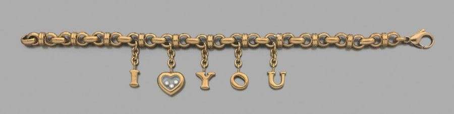 "I love you" Bracelet articulé en or 18k retenant des breloques formant un message dont une breloque en coeur ornée de trois diamants mobiles. Signée et dans son écrin. Poids brut: 36.4 gr A diamond and yellow gold bracelet by Chopard.