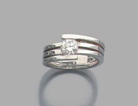 Bague en or gris 18k sertie d'un diamant de taille brillant sur trois anneaux ajourés. Tour de doigt: 54 - Poids brut: 9gr Diamant accompagné d'un certificat IGI précisant Poids:0.90 carats Couleur: E Pureté: VS2 A diamond and white gold ring.