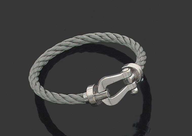 "Force 10" Bracelet "cable" en acier et or gris. Signé et numéroté. Pochette et papier d'origine A steel and white gold bracelet by Fred.