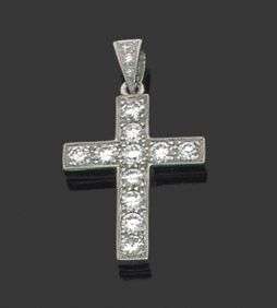Pendentif "croix" en or gris 18k serti de diamants de taille brillant. Hau