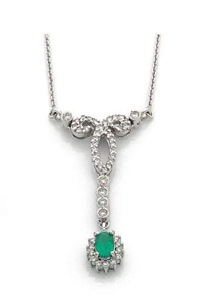 Collier en or gris 18k orné d'une volute centrale sertie de brillants et retenant une émeraude de taille ovale dans un entourage de brillants. Long: 4 cm - Poids brut: 5.25 gr An emerald, diamond and white gold necklace.