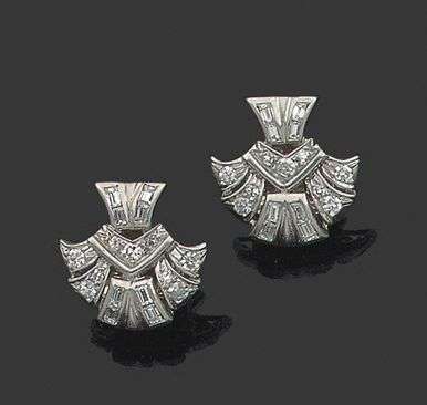 Paire de clips d'oreilles en platine et or gris 18k pavés de diamants huit- huit et de taille baguette. Vers 1940. Poids brut: 7.5 gr A diamond, platinium and white gold pair of earrings.
