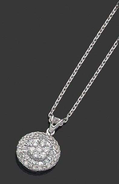Pendentif rond en or gris 18k serti de diamants de taille brillant et baguette. Chaine en or gris 18K. Poids des diamants:0.45 ct env. Poids brut: 3.65 gr A diamond and white gold pendant.