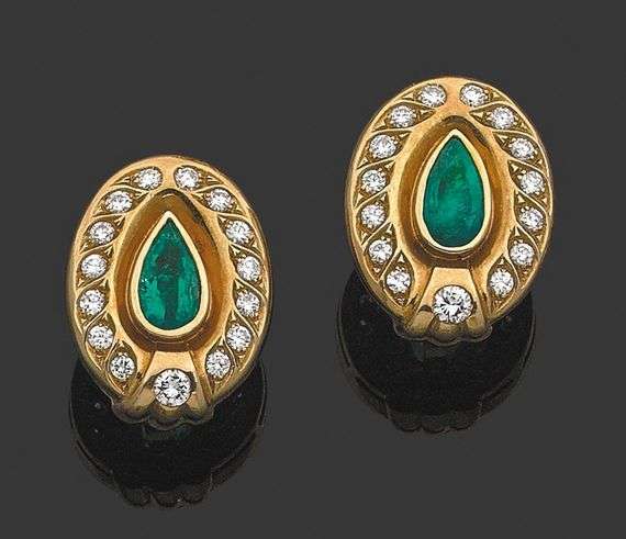 Paire de clips d'oreilles en or jaune 18k sertis d'une émeraude de taille poire dans un entourage de diamants. Haut: 2.5 cm - Poids brut: 21.9 g An emerald, diamond and yellow gold pair of earrings.