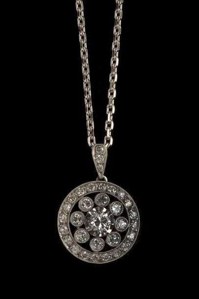 Pendentif en platine serti de diamants de taille ancienne. Chaine en or gris. Poids brut: 7gr A diamond and platinium pendant. Lot visible sur www.aguttes.com