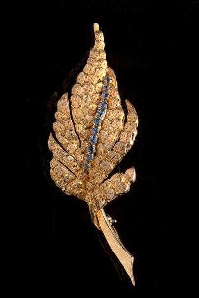 Broche "feuille" en or jaune ciselé sertie d'une ligne de saphirs au centr