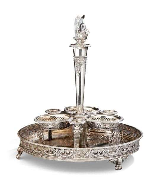 Cabaret en argent posant sur trois pieds griffes feuillagés. La galerie ajourée de papillons et guirlandes fleuries maintenues par des noeuds et encadrés d'une frise de perles et de raies de coeurs. Le fût en gaine décoré en partie haute de palmettes, de perlés encadrant des fleurs sur un fond amati et est surmonté d'une prise en forme de cygne. Les trois portes bouteilles et porte bouchons ajourés d'arcatures et soutenus par des corbeilles de fruits et couronnes de lauriers et de pilastres à motifs de plumes. Monogramme dans un écusson. Paris 1819-1838 Orfèvre: Pierre-Jacques Meunier Dim.: 36 x 31 cm Poids: 1.700 g on y joint trois gobelets en verre taillé