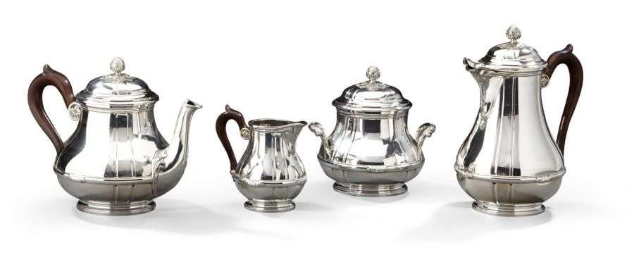 Service à thé et café en argent uni composé de quatre éléments, une théière, une cafetière, un pot à lait et un pot à sucre. Modèle posant sur piedouche à large panse ceinturée d'un jonc feuillagé, le corps orné de huits canaux. Prise en pomme de pin sur un tertre de palmes et acanthes. Manches en bois. Poinçon minerve Orfèvre: Bointaburet, poinçon, estampille et numéroté Poids brut total: 2.290 g
