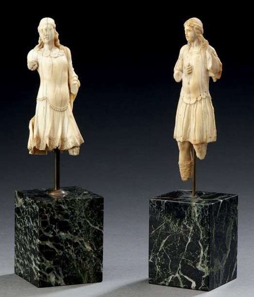 Paire de statuettes en ivoire finement sculpté représentant deux personnages vêtus «à l'antique»| socles de marbre brèche vert. Epoque XVIIème siècle H totale: 22 cm. gerces, accidents et manques