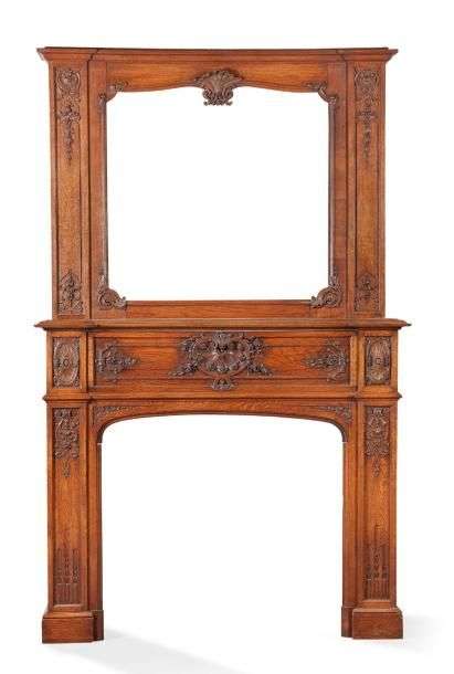 Importante cheminée de boiserie et son trumeau en chêne mouluré et sculpté