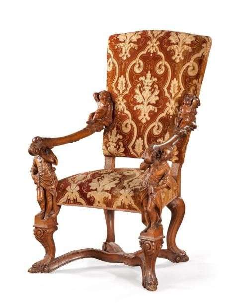 Fauteuil d'apparat à dossier légèrement incurvé en noyer sculpté| les accotoirs ornés de putti soutenus par des Maures debout| les pieds incurvés se terminant en têtes d'animaux fantastiques réunis par une entretoise en X feuillagée. Travail italien de style baroque Dans le goût d'Andréa Brustolon Garniture de velours à réserves feuillagées. H: 117 - L: 78 - P: 80 cm. quelques piqûres