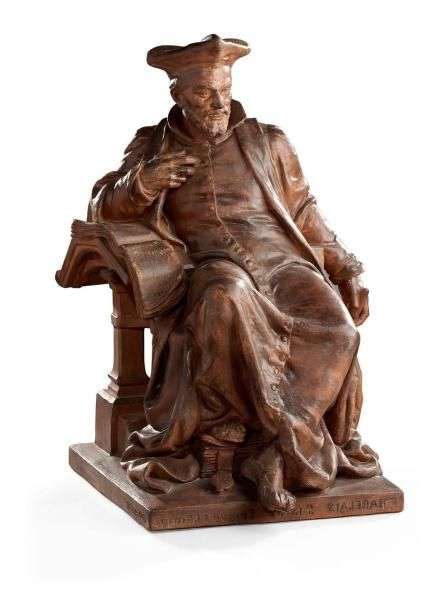 Statuette en terre cuite patinée représentant Rabelais assis et coiffé de la faluche, le coude droit reposant sur un ouvrage. Titrée: «F. Rabelais statue érigée à Chinon». H: 48 - L: 29 - P: 29,5 cm.