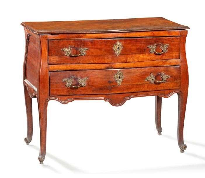 Commode en prunier mouluré de forme légèrement sinueuse, elle ouvre par deux tiroirs avec traverse et repose sur des pieds cambrés à enroulements. Travail provincial, probablement de l'Est de la France, du XVIIIème siècle H: 81 - L: 99 - P: 51 cm. légères fentes| un angle du plateau restauré
