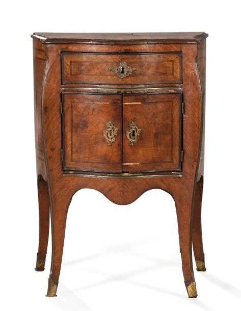 Commodine marquetée en ronce de noyer souligné de filets de palissandre| de forme sinueuse, elle ouvre par un large tiroir surmontant deux vantaux| montants à chanfreins à cannelures| pieds cambrés. Italie XVIIIème siècle H: 90 - L: 64 - P: 38 cm. éclats et restauration au placage| une serrure changée