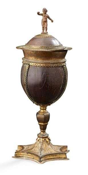 Noix de coco montée en laiton et bronze doré. Couvercle à prises en forme de putto en bronze doré. Panse à frise repercée en applique. Fût à ballustre à facette. Pied base en étoile à motif de rinceaux. XVIIIème siècle. Travail étranger. Inscrit sous la base SPERAINDE SPIRTEL. Usures à la dorure. H: 31 cm.