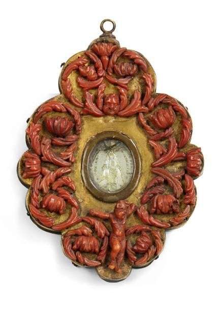 Plaque polylobée en laiton doré à décor en applique de corail sculpté de rinceaux, fleurs, putto| au centre, une médaille miraculeuse. Trapani, fin du XVIIème ou début du XVIIIème siècles. H: 7,5 - L: 7,2 cm. médaille rapportée