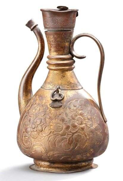 Belle et rare aiguière en Tombak en cuivre doré au mercure, de forme balustre reposant sur un pied douche à renflement, le couvercle à vis. Le bec tubulaire et l'anse en forme de rinceaux. Elle est décorée sur la panse de fleurs diverses, de tulipes et de rinceaux en travail repoussé et ciselé. Deux passants trilobés articulés à l'épaulement de chaque côté. H: 28,5 cm Manque la partie haute du bouchon. Pièce similaire sans son couvercle reproduit dans (Allan, 1986, pages 114-115) Bibliographie: J.W.Allan, Metalwork of the Islamic World, London 1986, p. 114-115. Couleurs d'Orient, Art et arts de vivre dans l'Empire Ottoman, catalogue d'exposition, Villa Empain, Fondation Bogossian, Bruxelles, 18 novembre 2010-27 février 2011, p.4.