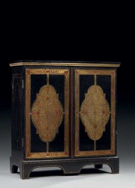 Meuble à hauteur d'appui en marqueterie dite Boule de laiton et palissandre à décor de larges réserves ornées de rinceaux et feuilles stylisées sur contrefond de bois noirci encadrés de frises à fleuron et écoiçons feuillagés. Plateau à simple décor de losanges en filets de laiton de forme rectangulaire. Il ouvre par deux vantaux et repose sur base pleine chantournée. Epoque Louis XIV H: 113 cm - L: 104 cm - P: 48 cm. Restauration, quelques manques et soulèvements de filets