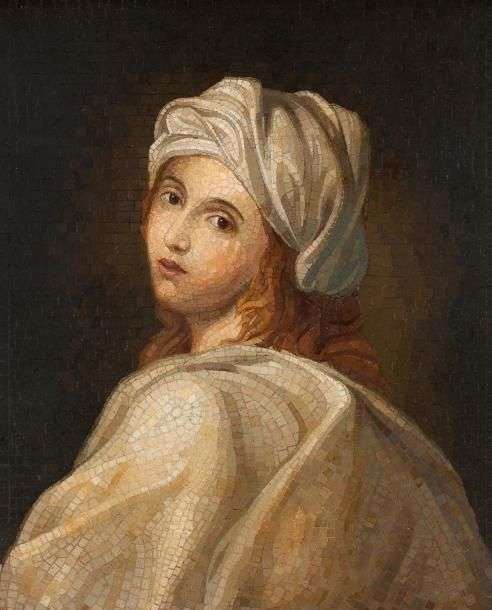 Portrait de Béatrice Cenci Plaque en mosaïque de moyennes tesselles sur ardoise Travail italien du XIXème siècle. H: 70 - L: 59 cm.