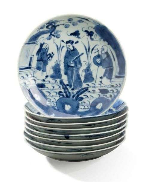 Huit assiettes en porcelaine à décor de personnages en bleu sur fond blanc