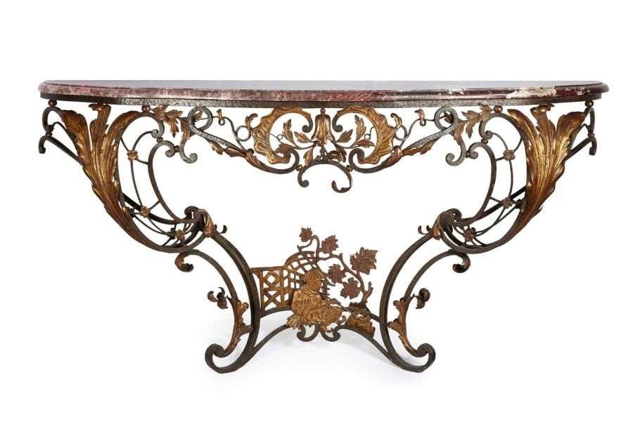 Importante console en fer forgé et fer battu doré| la ceinture à cartouche rocaille ornée de fleurs et feuillages dans un environnement de crosses| les montants à larges feuilles d'acanthe s'appuyant sur un treillage à fleurettes| l'entretoise ornée d'un Chinois fumant sous une tonnelle. XVIIIème siècle Plateau de marbre brèche violette. H: 90 - L: 177 - P: 50 cm.