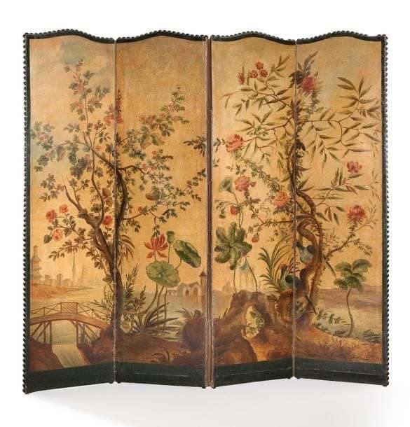 Paravent à quatre feuilles en toiles peintes à décor de paysages lacustres à pagodes, arbres fleuris et oiseaux. Le verso à décor de paysages et branchages en camaïeu de vert. XVIIIe siècle (restaurations). Dimensions d'une feuille: H: 197 - L: 53 cm.