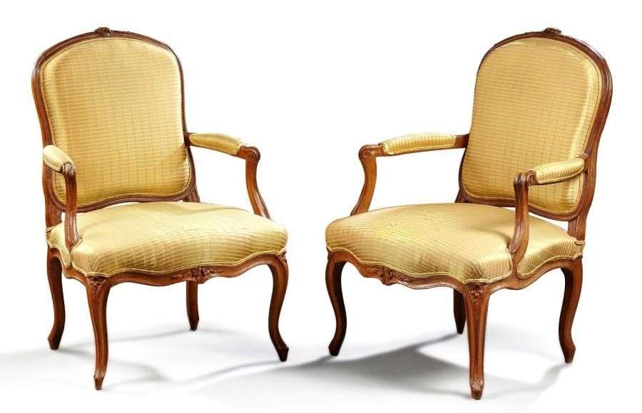 Deux fauteuils à dossier plat formant pendant en hêtre naturel mouluré et sculpté à décor de fleurettes et feuilles| supports d'accotoirs en coup de fouet| pieds cambrés à filets et enroulements. L'un estampillé Bonnemain et JME. Epoque Louis XV. Garniture de soie jaune à quadrillage (usures). H: 94 - L: 66 - P: 70 cm.