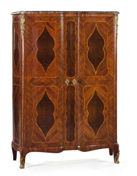 Armoirette marquetée en réserves de bois de violette de bout dans des encadrements contournés de placage de la même essence soulignés de filets de bois de rose| de forme arbalète, elle ouvre par deux vantaux| montants arrondis et petits pieds cambrés. Estampille de Bayer et JME. Epoque Louis XV (restauration). Plateau de marbre brèche rouge. H: 150 - L: 105 - P: 43 cm.