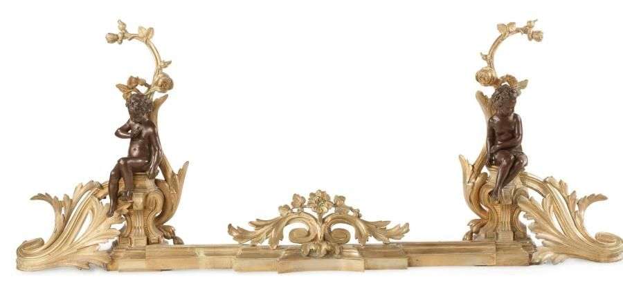 Barre de foyer en bronze ciselé, patiné ou doré à décor d'enfants allégori