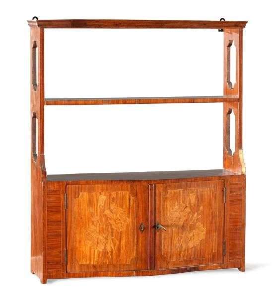 Etagère murale marquetée de branchages fleuris et feuillagés sur fond de bois de rose souligné de filets de buis| les côtés ajourés réunis par une tablette| elle ouvre par deux petits vantaux (petits manques au placage). H: 69 - L: 56 - P: 16 cm.