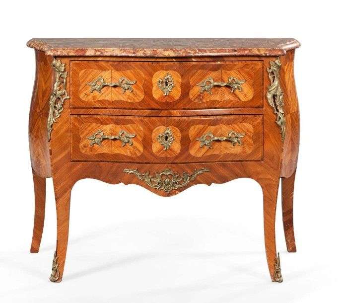 Commode marquetée de bois de rose dans des encadrements d'amarante| de forme mouvementée, la façade ouvre par deux tiroirs avec traverses| pieds cambrés| ornementation de bronzes tels que chutes, poignées, entrées, sabots et tablier. Plateau de marbre brèche d'Alep. Style Louis XV (quelques manques et restaurations). H: 85 - L: 106 - P: 54 cm.