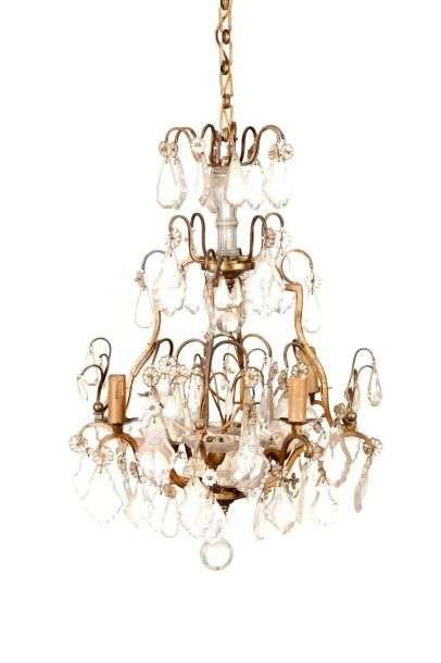 Lustre «cage» à huit lumières en bronze agrémenté de rosaces, plaquettes, gaine à godrons et sphères en cristal moulé taillé. Style Louis XV (monté à l'électricité). H: 58 - D: 40 cm.
