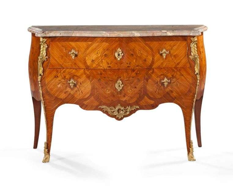 Commode marquetée de branchages fleuris et feuillagés sur fond de bois de rose dans des réserves de bois de violette| elle ouvre par deux tiroirs sans traverse| ornementation de bronze ciselé et doré tels que chutes, entrées et tablier. Plateau de marbre Sarrancolin. Style Louis XV. H: 86 - L: 124 - P: 50 cm.