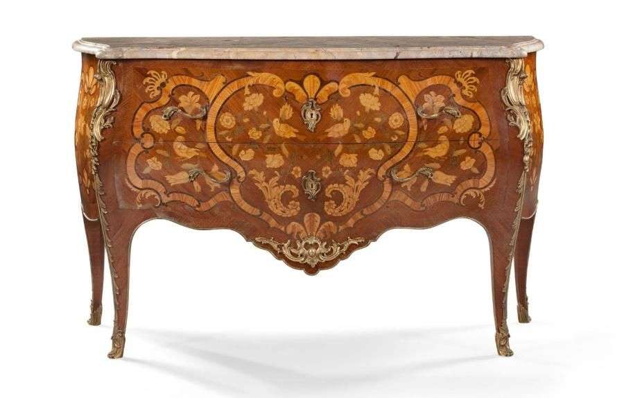 Large commode richement marquetée de réserves à décor d'oiseaux dans des branchages fleuris et feuillagés sur fond de satiné| de forme mouvementée, elle ouvre par deux tiroirs sans traverse| ornementation de bronze ciselé et doré| plateau de marbre sarrancolin. Style Louis XV. H: 88 - L: 142 - P: 60 cm.