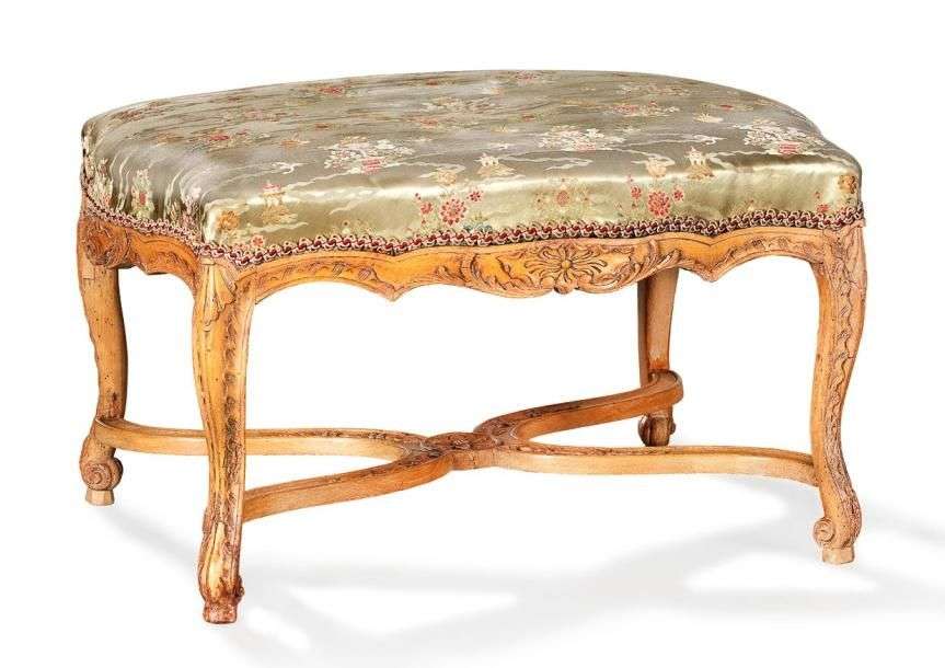 Large bout de pied en hêtre mouluré et sculpté à décor de rosaces rocailles soulignées de feuillages. De forme sinueuse, il repose sur des pieds cambrés à palmettes et festons se terminant par des enroulements renversés réunis par une entretoise (remplacée). Epoque Louis XV (renforts et piqûres). Garniture de soie à semis de fleurs et pagodes sur fond bleu pale. H: 44 - L: 76 - P: 64 cm.