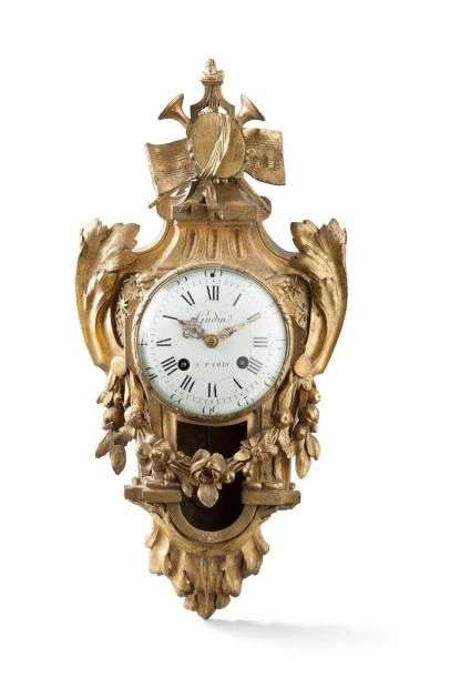 Charmant cartel d'alcôve en bronze finement ciselé et doré| à l'amortissement, les attributs de la musique| le corps flanqué de larges feuilles d'acanthe soutenant une guirlande de fleurs| culot feuillagé. Le cadran signé «Gudin à Paris» indique les heures en chiffres romains et les minutes en chiffres arabes. Epoque Louis XVI (sans timbre). H: 46 cm.