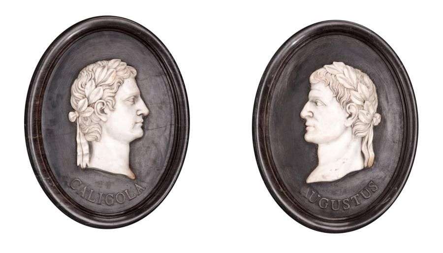 Paire de médaillons en marbre représentant les profils de Caligola et d'Au