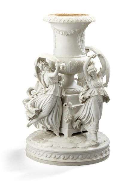 Centre de table en biscuit. Au centre entourant le socle d'un vase Médicis et formant une ronde de quatre bacchantes dansant ou jouant des cymbales sur une terrasse. Vers 1900, dans le goût du XVIIIe siècle Haut. 36 cm