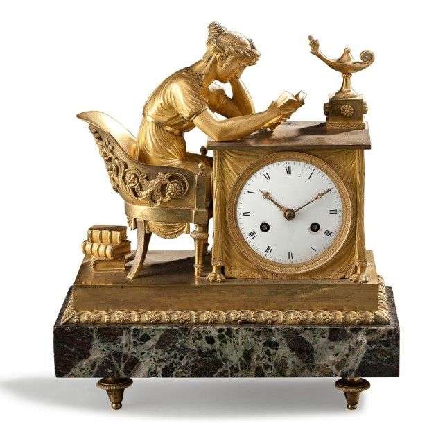 Pendule en bronze ciselé et doré représentant une jeune femme vêtue «à l'antique» assise dans un fauteuil lisant un ouvrage à la lueur d'une lampe à huile| le cadran indique les heures en chiffres romains et les minutes en chiffres arabes par tranches de quinze et est inscrit dans le drapé d'une table à pieds griffes| base pleine à frise de fleurons| socle en marbre vert antique (légers éclats)| petits pieds toupies. Epoque Empire (un petit élément manquant et légers éclats aux trous de remontage). H: 33,5 - L: 29 - P: 13 cm.