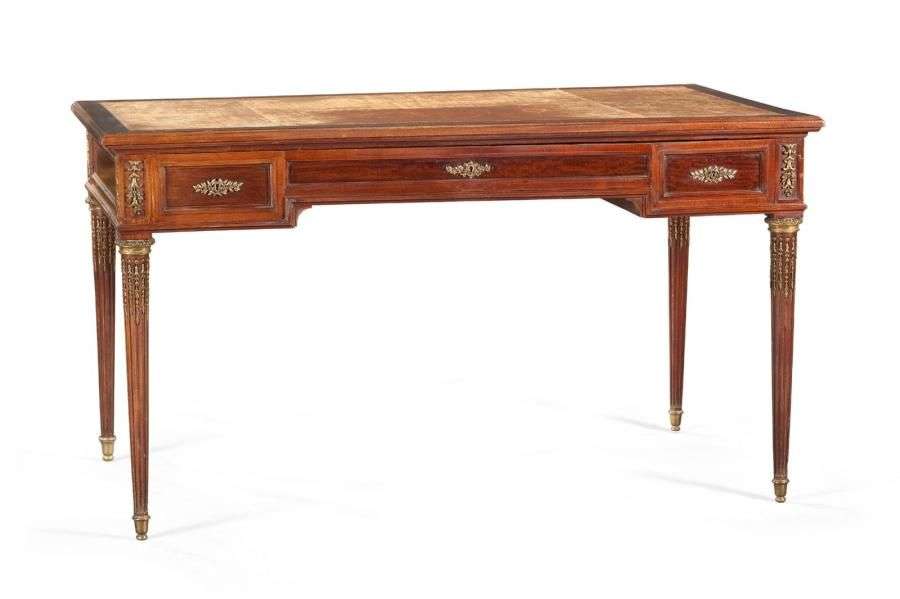 Bureau plat en acajou et placage d'acajou| de forme rectangulaire, il ouvre par trois tiroirs, dont un large central et repose sur des pieds fuselés à cannelures. Riche décor de bronze ciselé et doré tels qu'entrées de serrures, chutes à fleurons, bagues à godrons, asperges et sabots. Plateau gainé de cuir havane. Style Louis XVI. H: 79 - L: 140 - P: 81 cm.