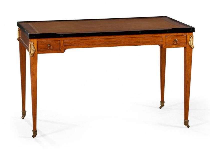 Tric-trac plaqué de bois de rose de fil. De forme rectangulaire, il ouvre par deux tiroirs en opposition| le plateau réversible découvre le jeu plaqué de palissandre à index en os naturel ou teinté vert. Epoque Louis XVI (restauration d'usage). Chutes d'angles à drapés en bronze doré. On y joint un lot de jetons et deux portes-lumières. Plateau gainé de cuir tabac à décor aux petits fers ou de drap beige. H: 70 - L: 112 - P: 61 cm.
