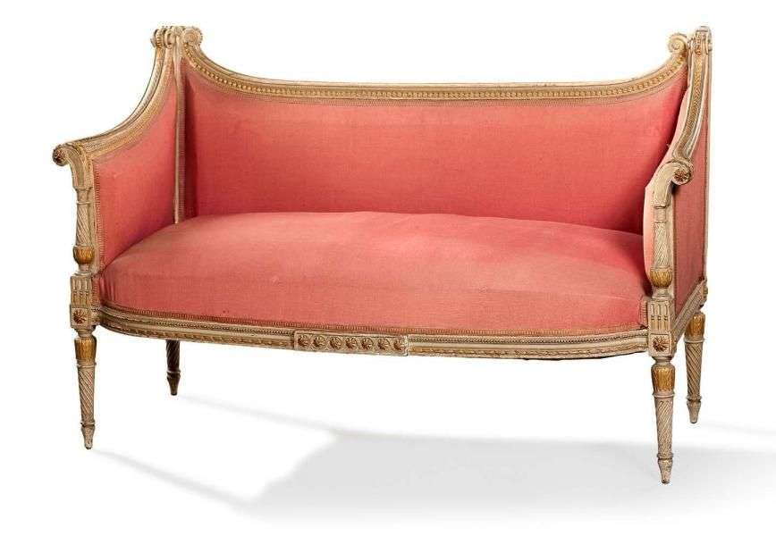 Petit canapé en bois mouluré, sculpté, doré et rechampi crème à décor de frises de piastres, rangs de perles et feuilles d'acanthe| consoles d'accotoirs à balustres| dés à rosaces| pieds fuselés à feuilles d'eau et cannelures torses. Ancien travail de style Louis XVI (manque les motifs sommitaux du dossier). Garniture de tissu rose. H: 83 - L: 124 - P: 57 cm.