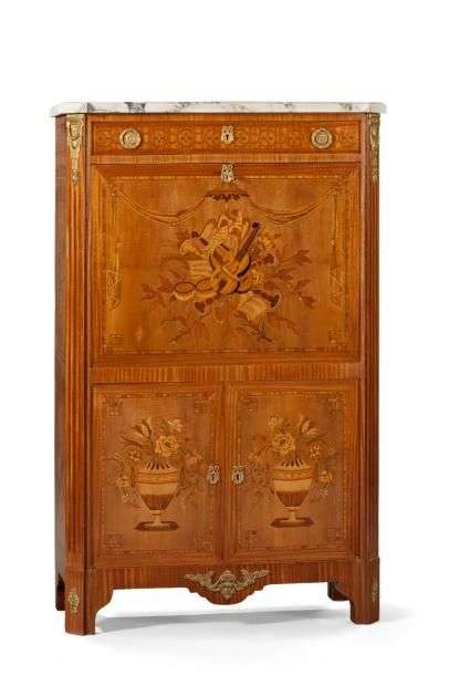 Secrétaire marqueté d'attributs de musique ou vases fleuris sur fond de sy