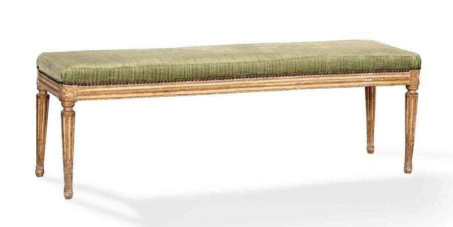 Banquette à toutes faces en hêtre mouluré, sculpté et laqué crème| dés arrondis à rosaces| pieds fuselés à cannelures rudentées. Epoque Louis XVI (piqûres| un renfort métallique). Garniture en velours vert amande. H: 44 - L: 129 - P: 42 cm.